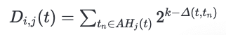 D i,j ​ (t) is calculated by combining the timestamps maintained in the attestation history, which records the attestation tickets towards the neighbour (Nj). It is an integer interpreted as a bitmap vector with the length of k. Each bit represents a timestamp one step away from its higher adjacent bit, and the highest bit indicates the time t. A bit is set to 1 when an attestation is performed at the step it stands for. Thus, the direct trust, calculated as above, reflects all the recent successful attestations up to time t. AHj(t) denotes the attestation history for node Nj at time t. As a step is defined as minimum attestation interval, different timestamps t in AH do not indicate a same bit index. We can thus safely use summation instead of bitwise OR (“|”) for setting the corresponding bits.